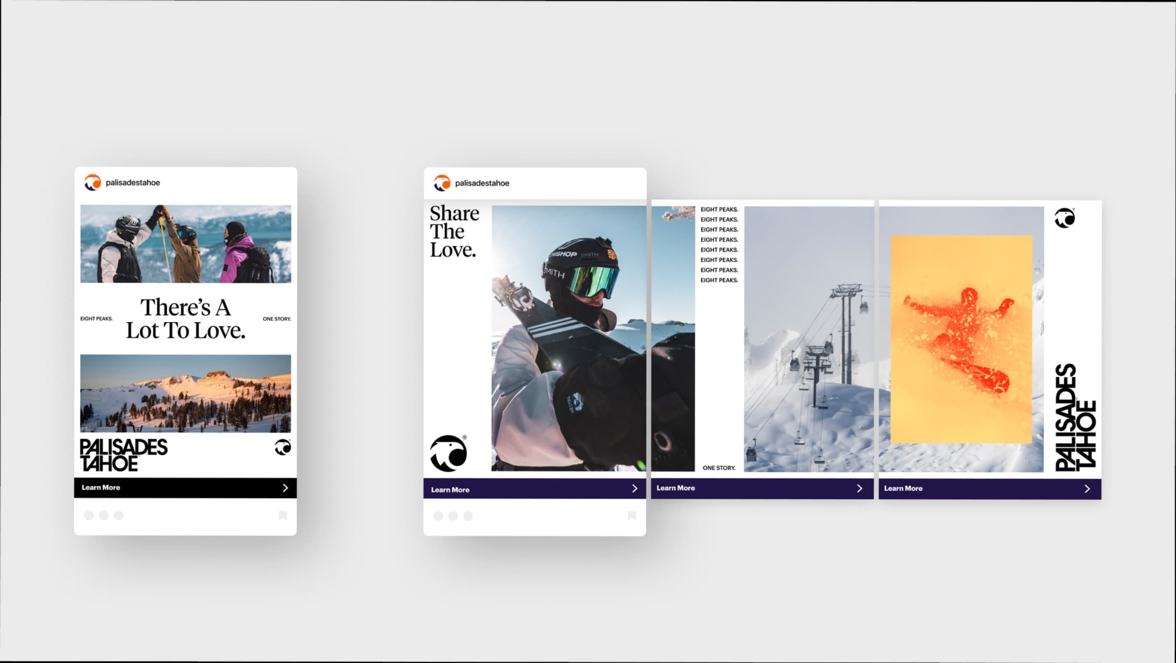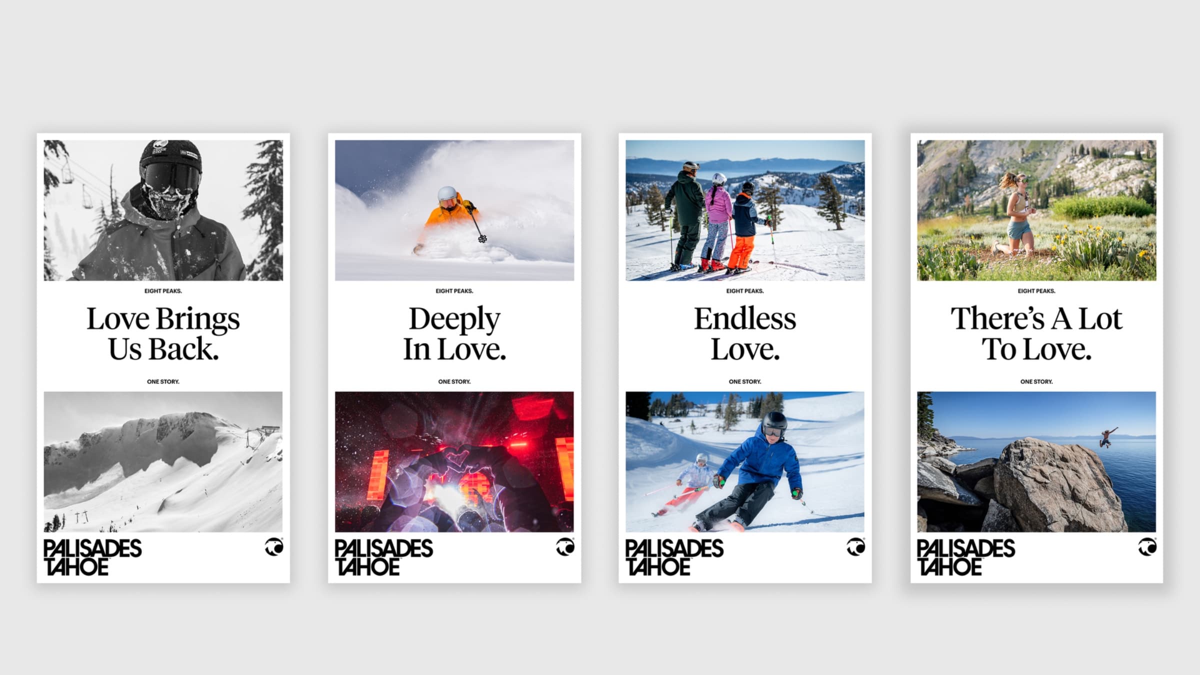 Three consecutive seasons of full-scope campaign production for Palisades Tahoe — one of the most respected ski destinations in North America. Work covered everything: brand design and assets for internal and consumer-facing use, campaign narrative and strategy, seasonal visual identity updates, merchandise, social, content planning, and photo and video treatments.